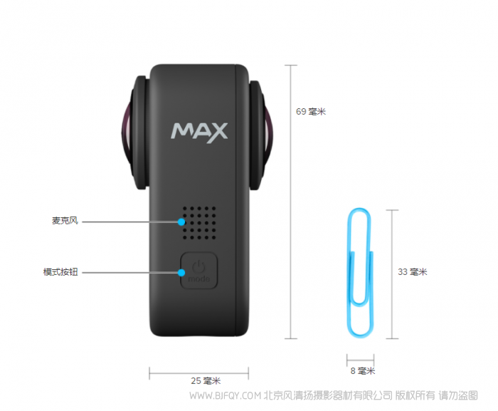 传统 GoPro HERO 拍摄 + 360 度拍摄 | Max HyperSmooth 超强防抖,视频卓越稳定 | 地平线修正 | PowerPano 超扩全景 | 优质 360 度音效 + 立体声音频 | 定向音频 | 数码镜头 | Max TimeWarp 移动延时 | 直观触屏 | 触摸缩放 | 1080p 视频直播 | 语音控制 | 摄像机内置 360 度全景影像画面拼接 | 调整画面(使用 GoPro 应用) | 紧凑型设计,内置折叠接头 | 屏幕快捷方式 | 纵向拍摄 | 照片定时器 | 短片 | 坚固耐用 + 5 米防水 | Protune(照片、视频和 TimeWarp 移动延时) | 2 倍慢动作 | 高级元数据(仅限 HERO 模式) | GP1 芯片 | 1600mAH 锂离子可拆卸电池