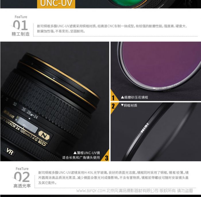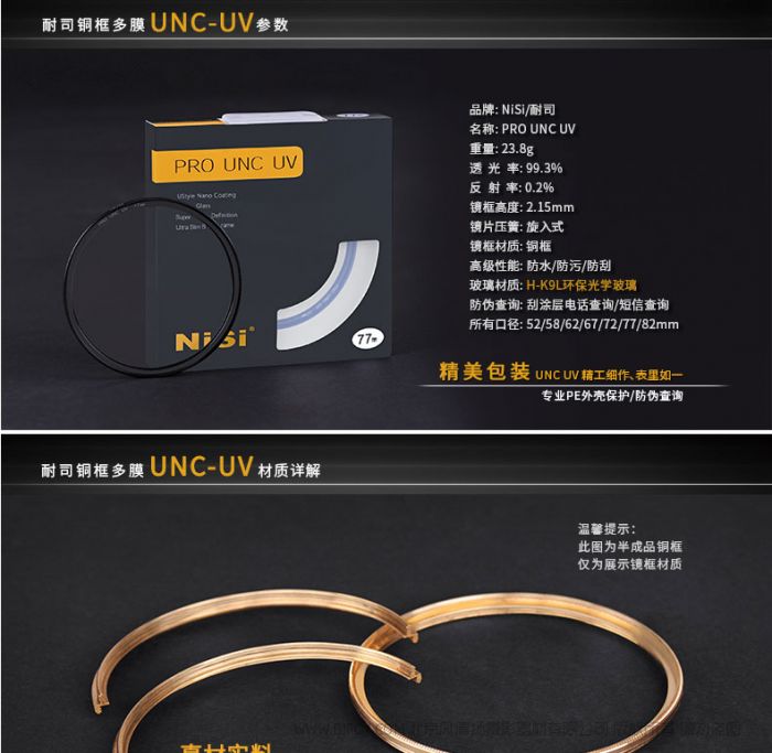 耐司(NiSi)UNC UV保护镜 超薄高清滤镜 67mm 佳能 尼康 黑色 77mm 极致超薄铜框U型纳米镀膜+防水镀膜 金色 黑色 双色可选