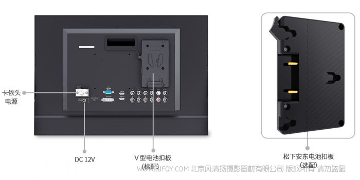 外景拍摄常常使用直流电源为设备供电。4K215-9HSD-192-CO配备索尼V型电池扣板,可以使用电压为14.4V的摄像机锂离子电池为设备供电。一组130Wh的摄像机电池,可提供超过6个小时的连续供电时间。大大节省了备用电池的携带数量。也可选配松下安东电池扣板。
