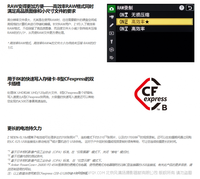 *2 使用EN-EL18d可充电锂离子电池组,温度为 23°C时。开机后立即开始视频拍摄时。建议使用写入速度快的B型CFexpress卡录制视频。