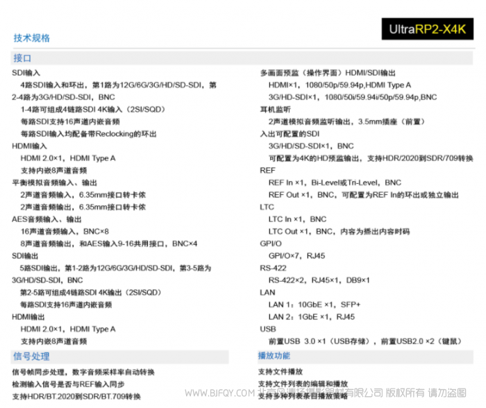 4K模式下支持单通道录/放,HD模式下支持 2录2放 4通道同时工作。支持12G/6G/3G/HD/SD-SDI、4路SDI、HDMI2.0、模拟音频、AES音频等视音频接口,还支持万兆LAN、USB3.0等数据接口
