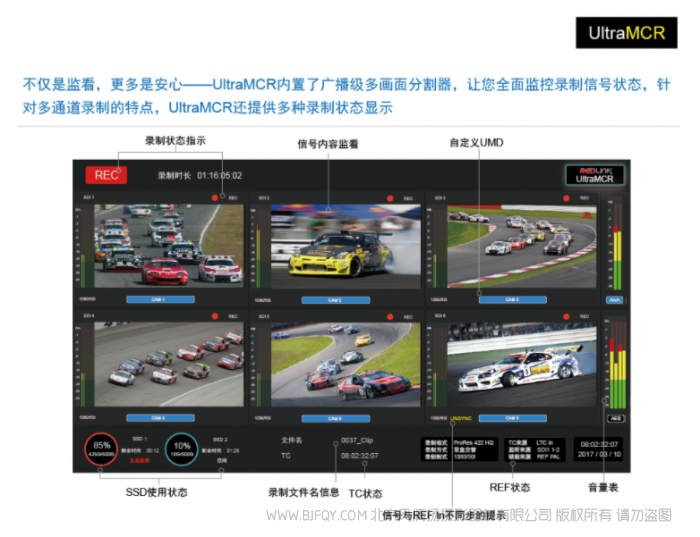 一款广播级多通道SSD+NAS录像机,基于先进的嵌入式硬件编码技术,UltraMCR体积小、功耗低,但能力惊人,在标准1RU机架空间内,可帧精度同步录制8通道HD或1路4K/60p节目,广泛适用于演播室、转播车多迅道信号录制,以及节目收录、素材上载等应用场景