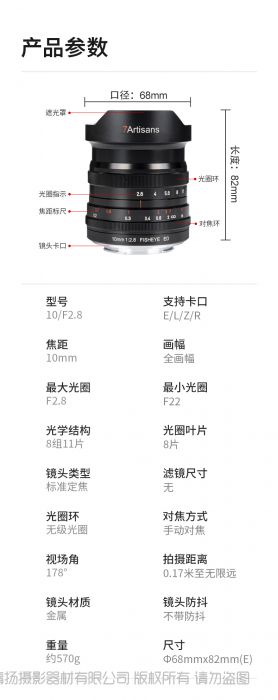 七工匠10mm f2.8鱼眼镜头全画幅超广角索尼R4佳能R6 尼康ZL口E口 佳能口