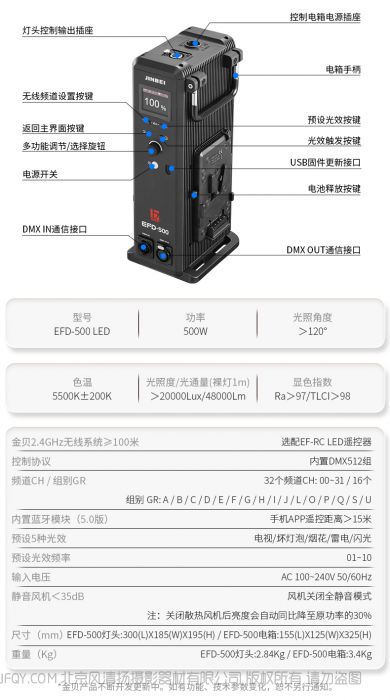 | 金贝2.4GHz无线系统≥100米 | 选配EF-RC LED遥控器 |