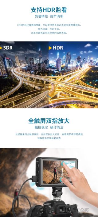 色彩超精准 200g轻薄设计 全触屏操控 双指缩放 HDMI信号输入输出 HDR监看 DC反供电设计 E6 NP-F一体化实际 3DLUT 变形功能
