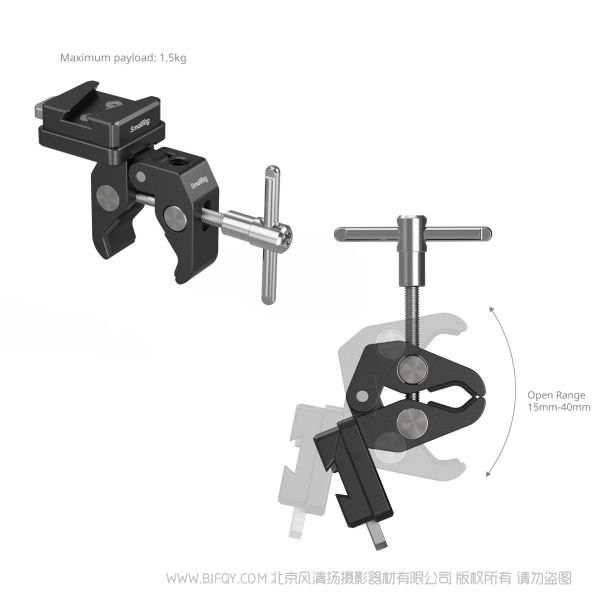 2.夹持范围15mm-40mm,内嵌防滑垫,安全稳固,实现脚架、灯架、手持环等位置安装;