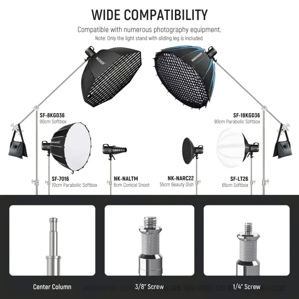 - Adjustable Height & Extension Arm- The center column with 3 sections is adjustable from 4.8ft to 10.5ft (146cm to 320cm) with a foam grip to prevent slipping in transit. The 4.2ft (128cm) extension arm with a 1/4” and 3/8” mounting screw on both ends is compatible with most equipment
