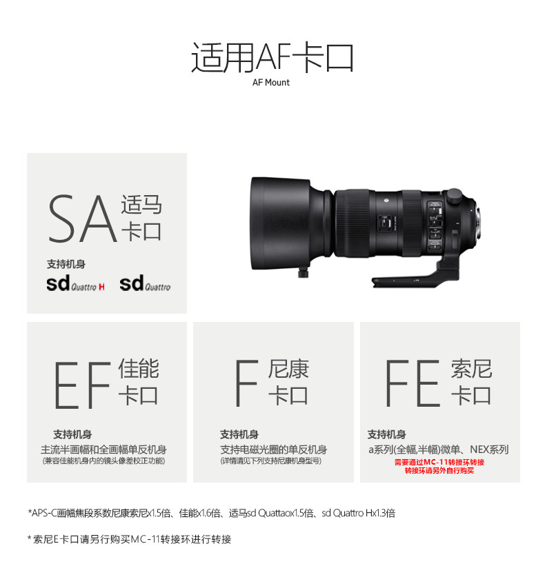 *当和支持F8对焦点的数码单反相机搭配使用时,在焦距大于300mm的长焦端时无法确保对焦精度。